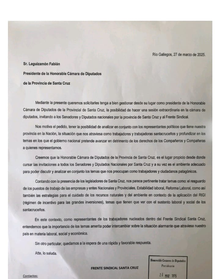 Mediante la presente queremos solicitarles tenga a bien gestionar desde su lugar como Diputado provincial de Santa Cruz, la posibilidad de hacer una sesi贸n extraordinaria en la c谩mara de diputados, invitando a los Senadores y Diputados nacionales por la provincia de Santa Cruz y al Frente Sindical.